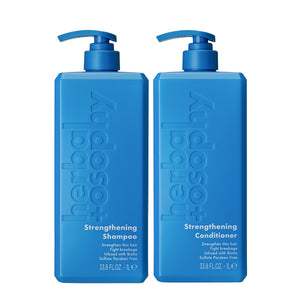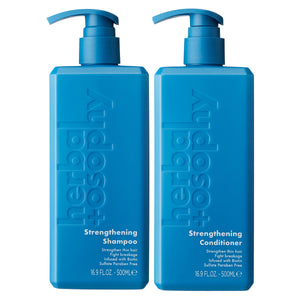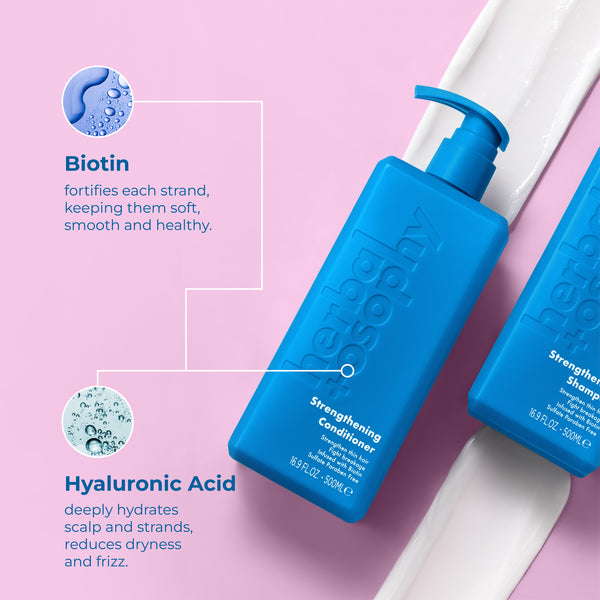 Achieve stronger, healthier hair with herbal+osophy Strengthening Shampoo, infused with the fortifying power of Biotin. This expertly crafted shampoo and conditioner set is designed to reinforce each strand, fight breakage, and promote vibrant, resilient hair.
